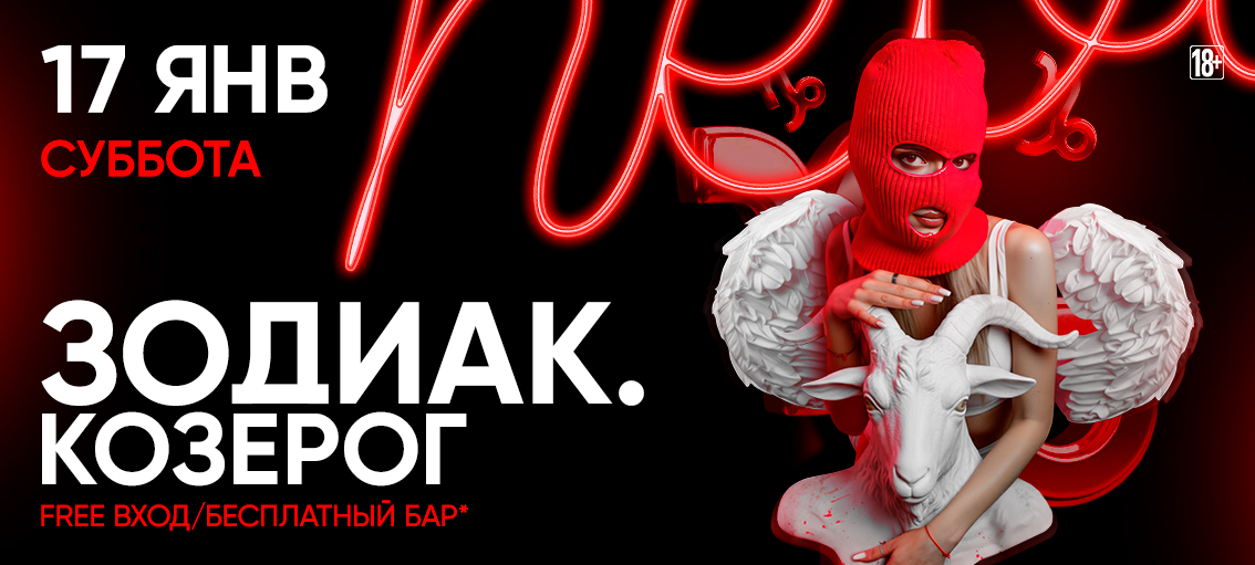 Серийная вечеринка ЗОДИАК. В январе танцполом правят КОЗЕРОГИ. С 00:00 до 01:00 — безлимит на баре, жоские предсказания на год от астролога и лототрон совместимости.
