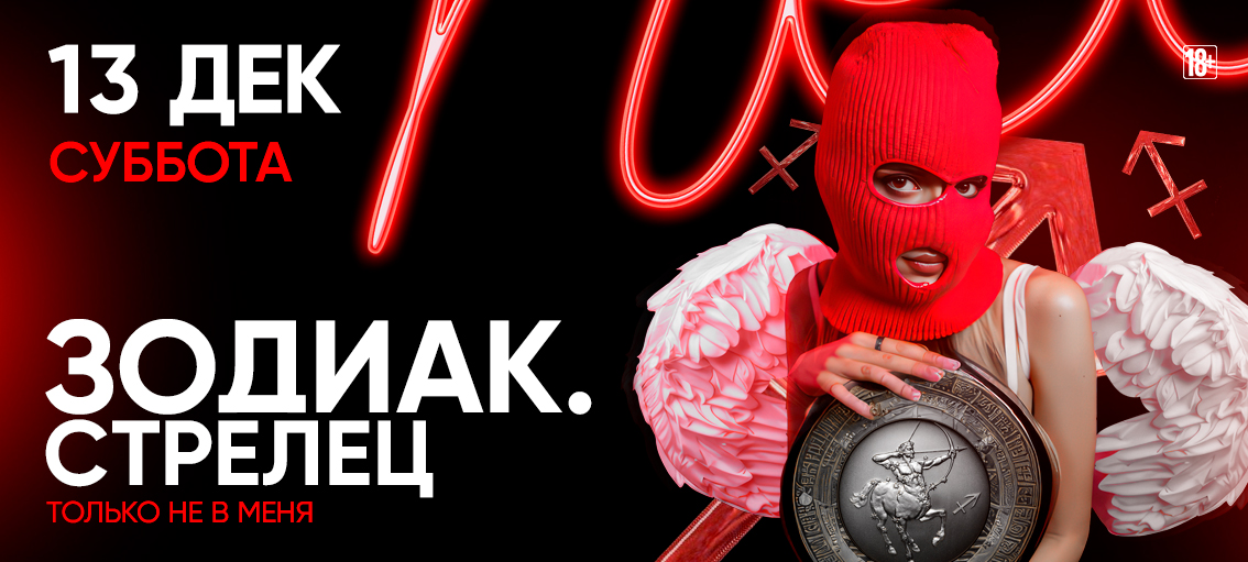 В декабре танцполом правят СТРЕЛЬЦЫ. Звезды выстроились, огненная вода наготове и ты в мире где нет промахов — только попа дания! Сходу для тебя: с 00:00 до 01:00 — безлимит на баре, жоские предсказания на год от астролога и лототрон совместимости.